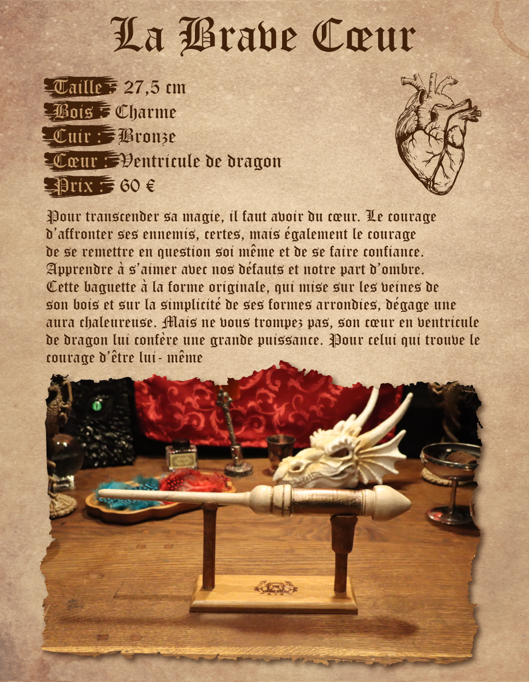 Pour transcender sa magie, il faut avoir du cœur. Le courage d’affronter ses ennemis, certes, mais également le courage de se remettre en question soi-même et de se faire confiance. Apprendre à s’aimer avec nos défauts et notre part d’ombre. Cette baguette à la forme originale, qui mise sur les veines de son bois et sur la simplicité de ses formes arrondies, dégage une aura chaleureuse. Mais ne vous trompez pas, son cœur en ventricule de dragon lui confère une grande puissance. Pour celui qui trouve le courage d’être lui-même.