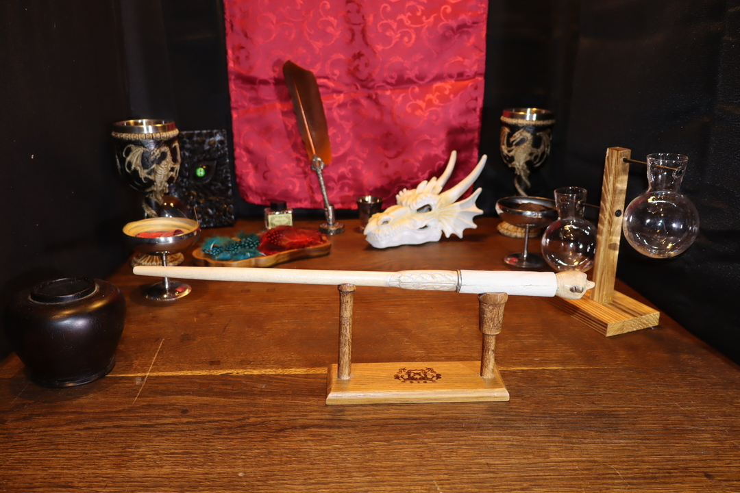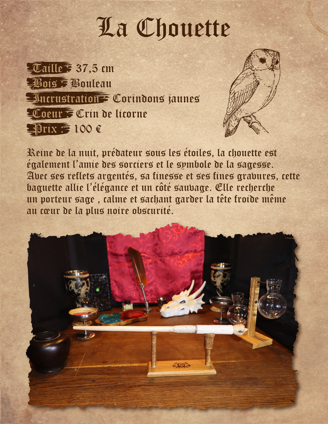 Reine de la nuit, prédateur sous les étoiles, la chouette est également l’amie des sorciers et le symbole de la sagesse. Avec ses reflets argentés, sa finesse et ses fines gravures, cette baguette allie l’élégance et un côté sauvage. Elle recherche un porteur sage , calme et sachant garder la tête froide même au cœur de la plus noire obscurité.