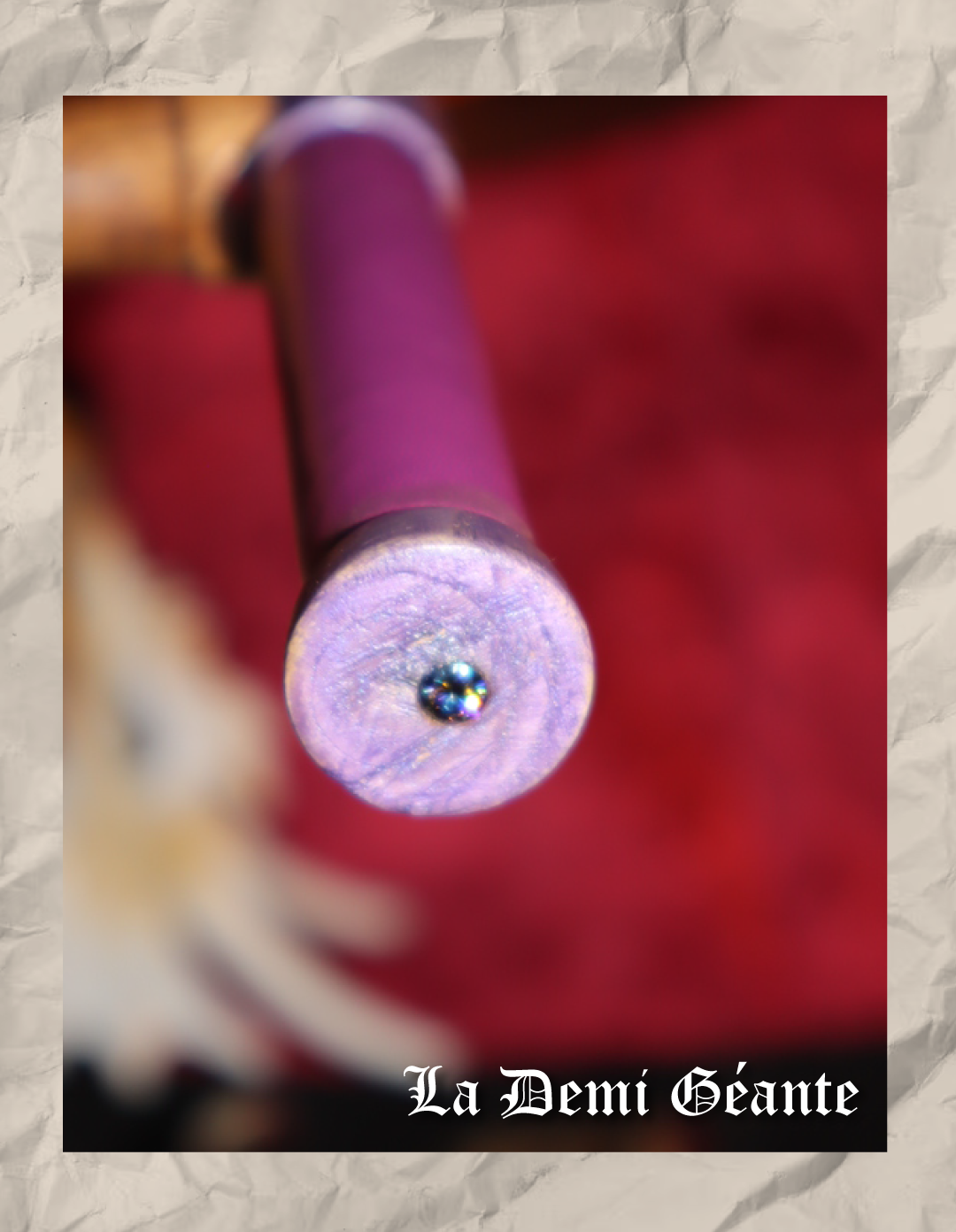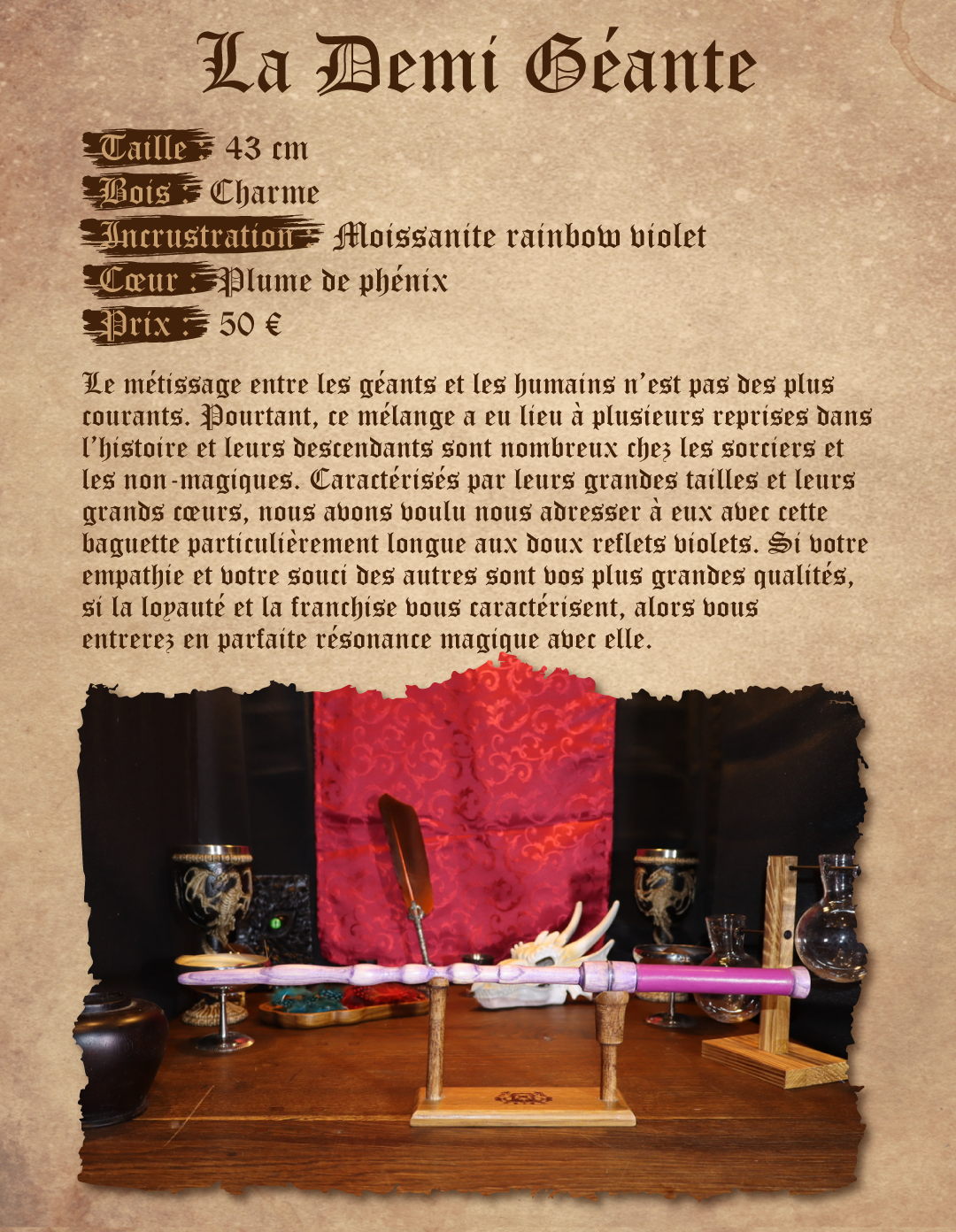 Le métissage entre les géants et les humains n’est pas des plus courants. Pourtant, ce mélange a eu lieu à plusieurs reprises dans l’histoire et leurs descendants sont nombreux chez les sorciers et les non-magiques. Caractérisés par leurs grandes tailles et leurs grands cœurs, nous avons voulu nous adresser à eux avec cette baguette particulièrement longue aux doux reflets violets. Si votre empathie et votre souci des autres sont vos plus grandes qualités, si la loyauté et la franchise vous caractérisent, alors vous entrerez en parfaite résonance magique avec elle.