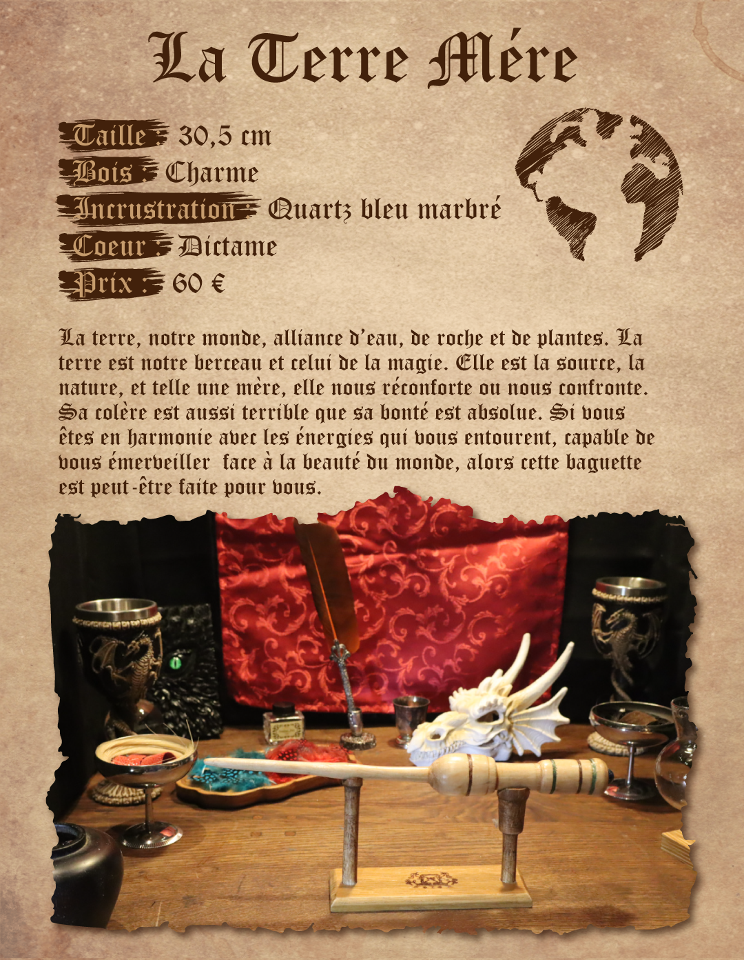 La terre, notre monde, alliance d’eau, de roche et de plantes. La terre est notre berceau et celui de la magie. Elle est la source, la nature, et telle une mère, elle nous réconforte ou nous confronte. Sa colère est aussi terrible que sa bonté est absolue. Si vous êtes en harmonie avec les énergies qui vous entourent, capable de vous émerveiller face à la beauté du monde, alors cette baguette est peut-être faite pour vous.