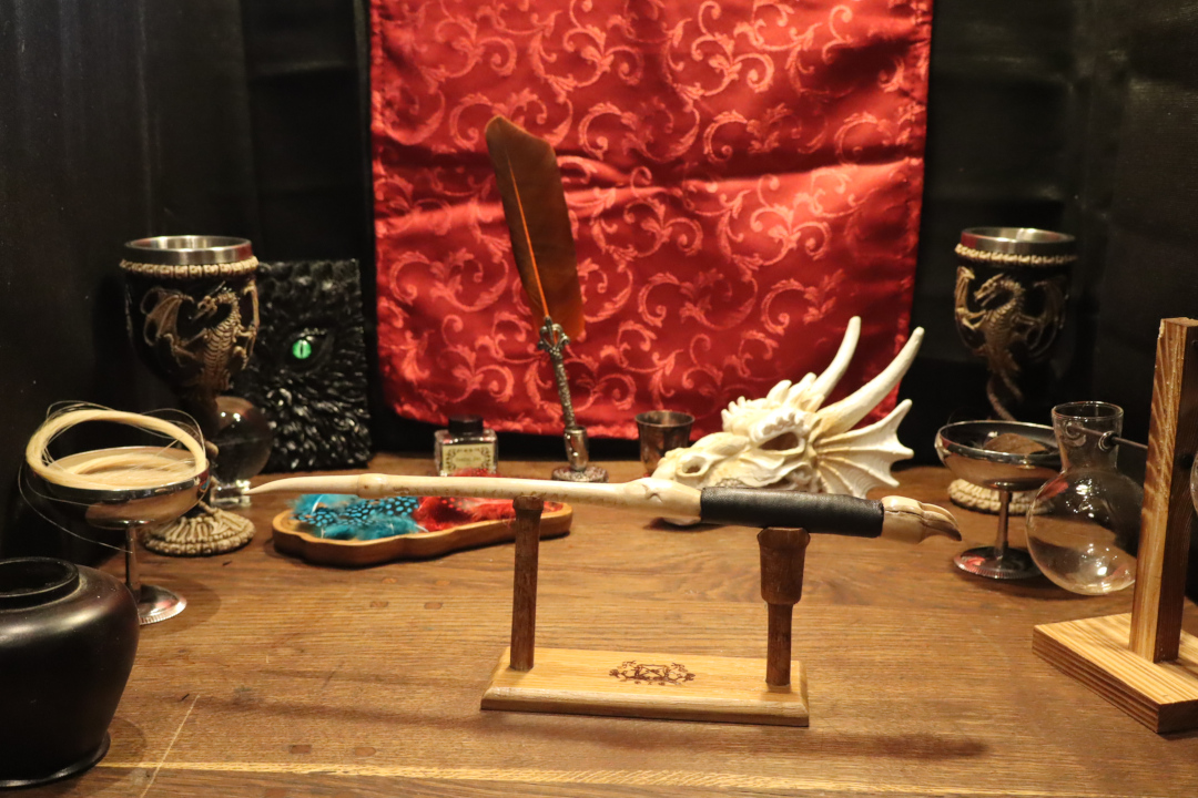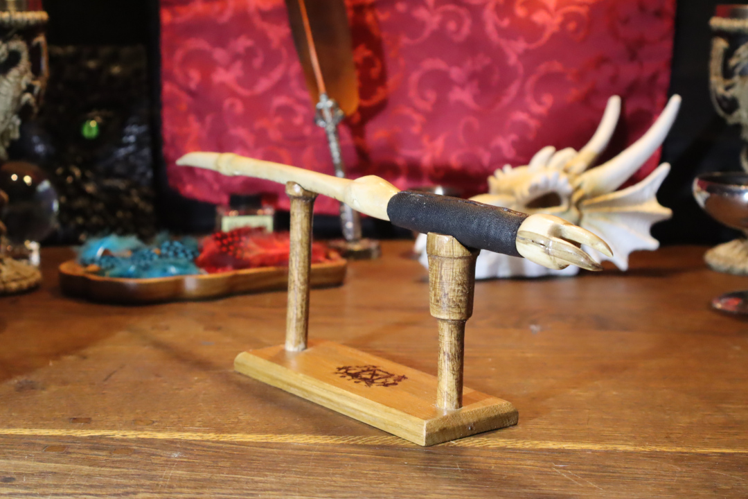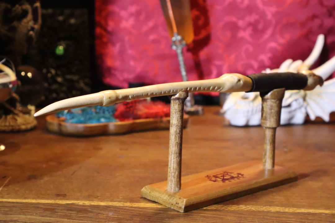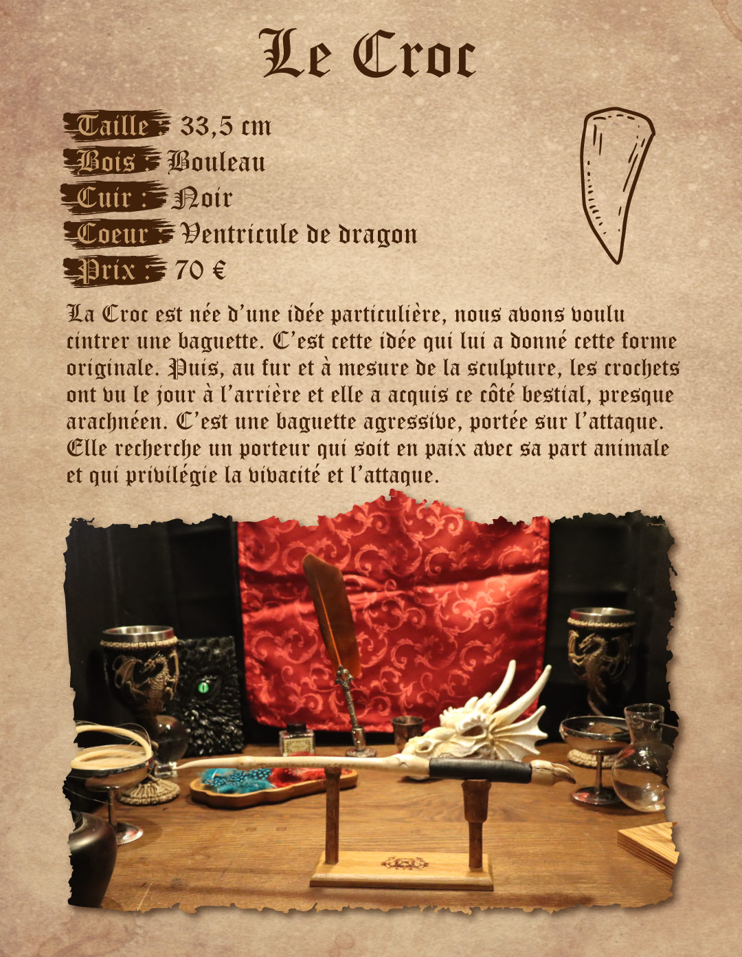 La Croc est née d’une idée particulière, nous avons voulu cintrer une baguette. C’est cette idée qui lui a donné cette forme originale. Puis, au fur et à mesure de la sculpture, les crochets ont vu le jour à l’arrière et elle a acquis ce côté bestial, presque arachnéen. C’est une baguette agressive, portée sur l’attaque. Elle recherche un porteur qui soit en paix avec sa part animale et qui privilégie la vivacité et l’attaque.