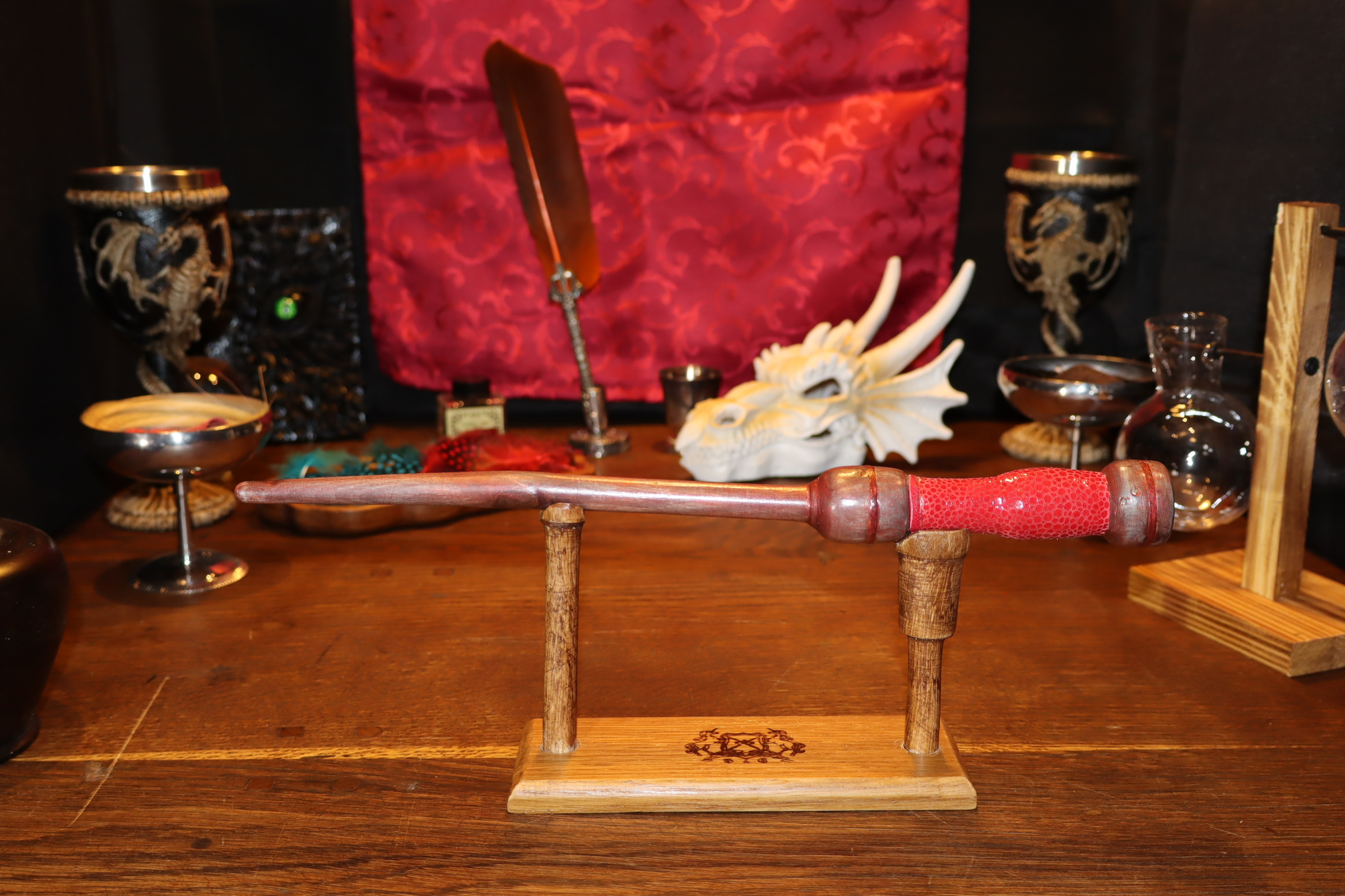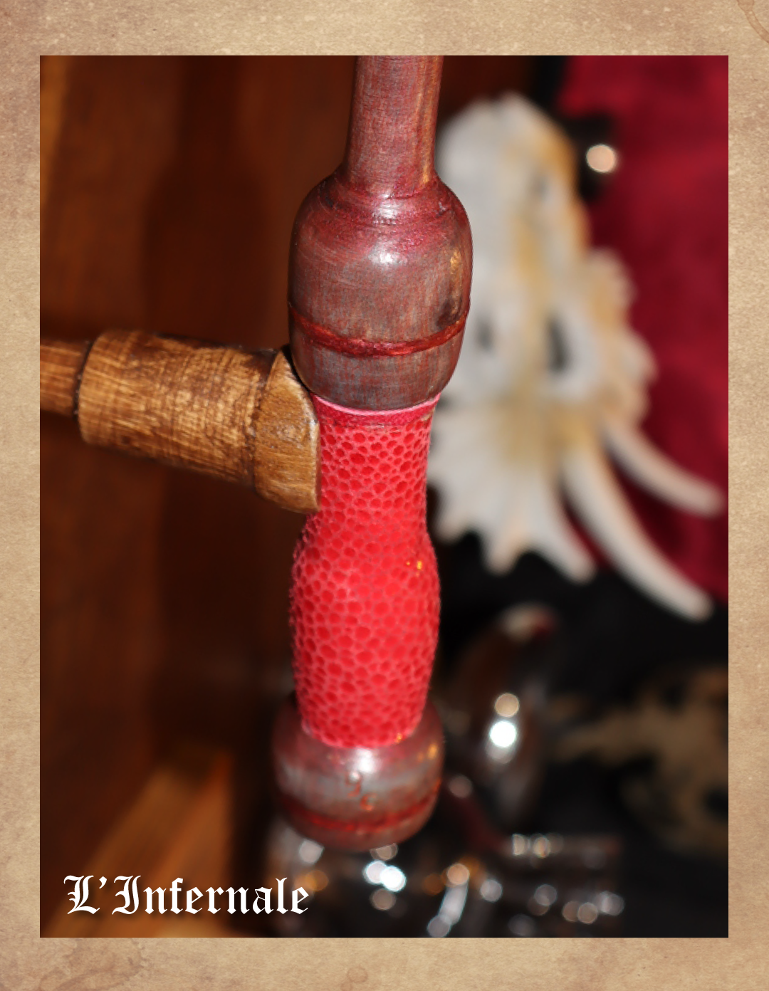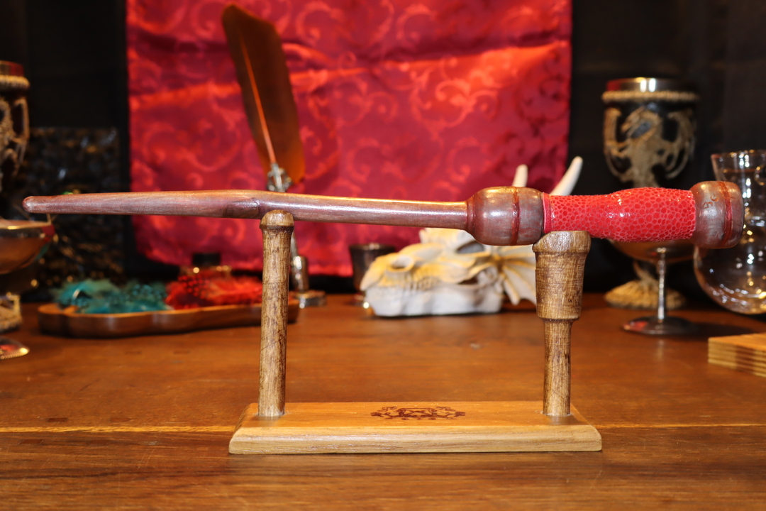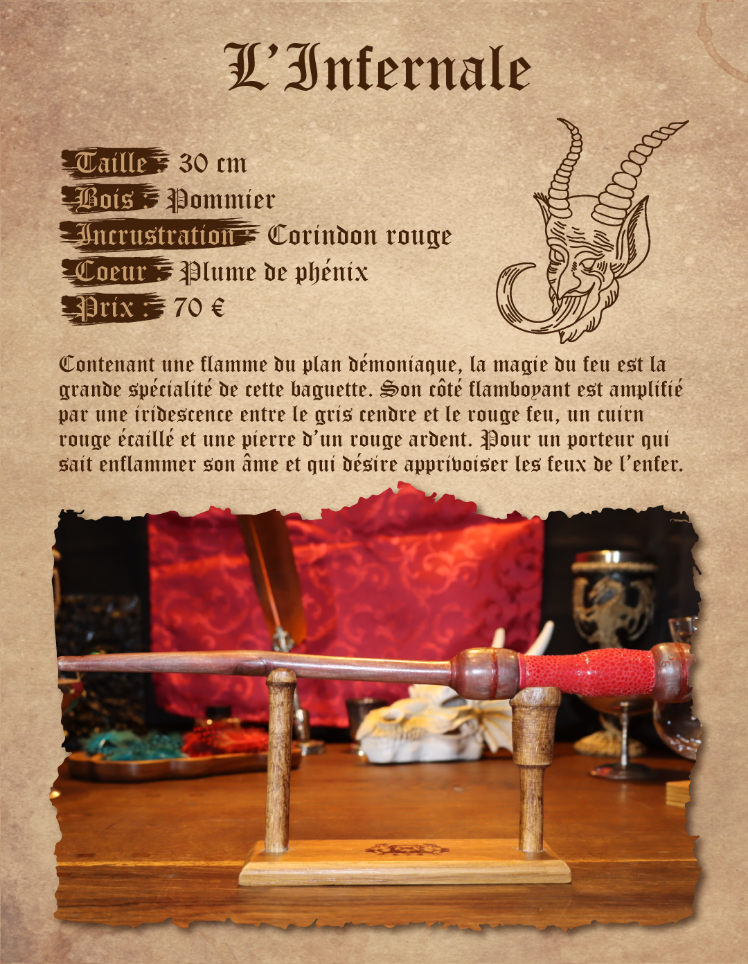 Contenant une flamme du plan démoniaque, la magie du feu est la grande spécialité de cette baguette. Son côté flamboyant est amplifié par une iridescence entre le gris cendre et le rouge feu, un cuir rouge écaillé et une pierre d’un rouge ardent. Pour un porteur qui sait enflammer son âme et qui désire apprivoiser les feux de l’enfer.